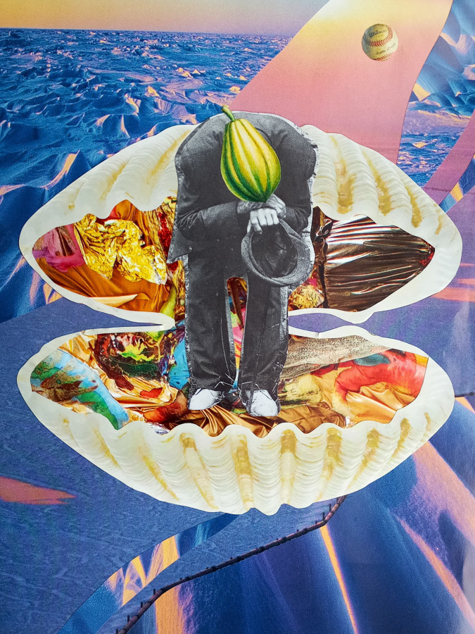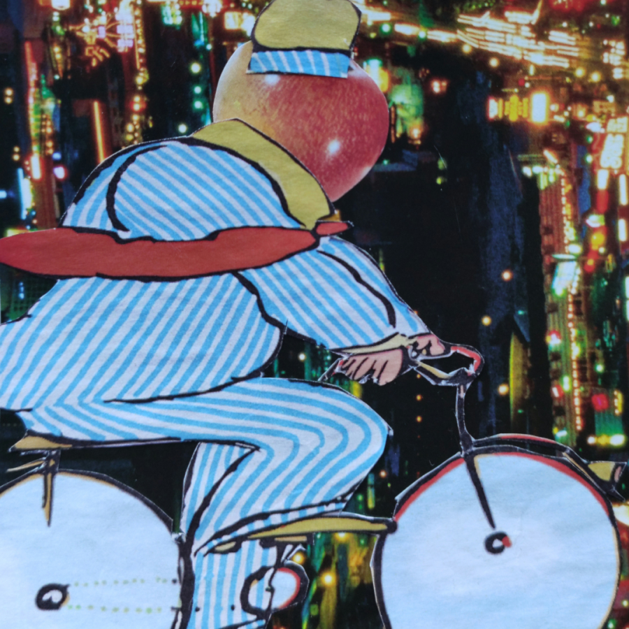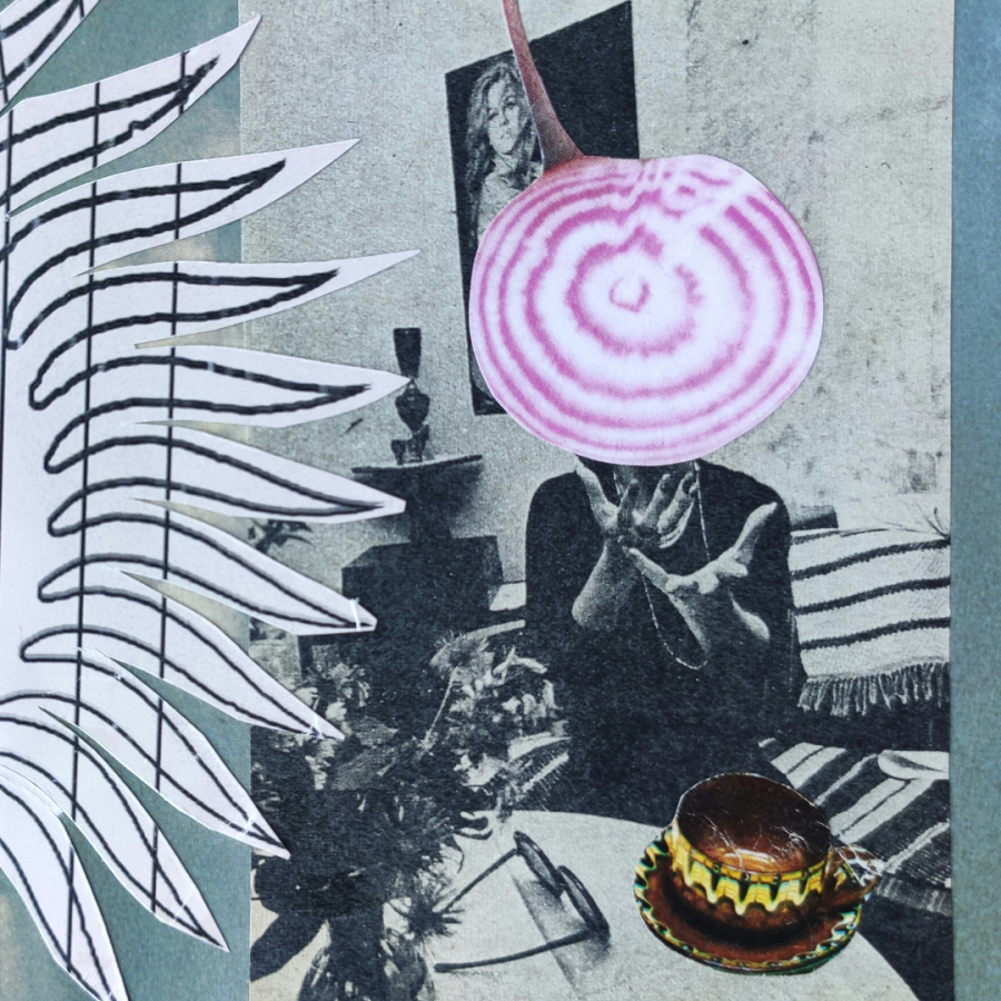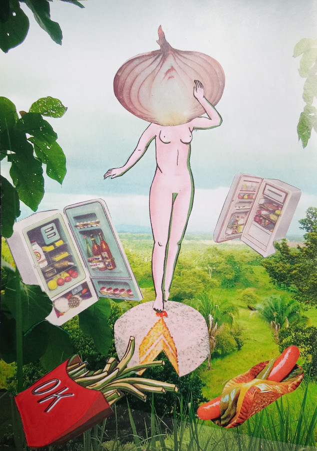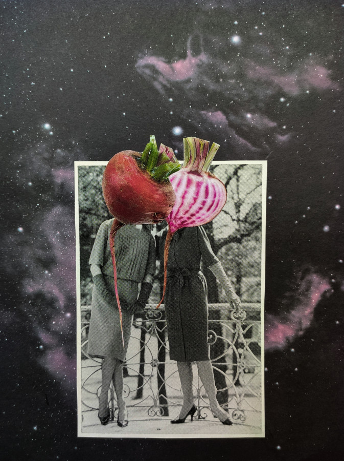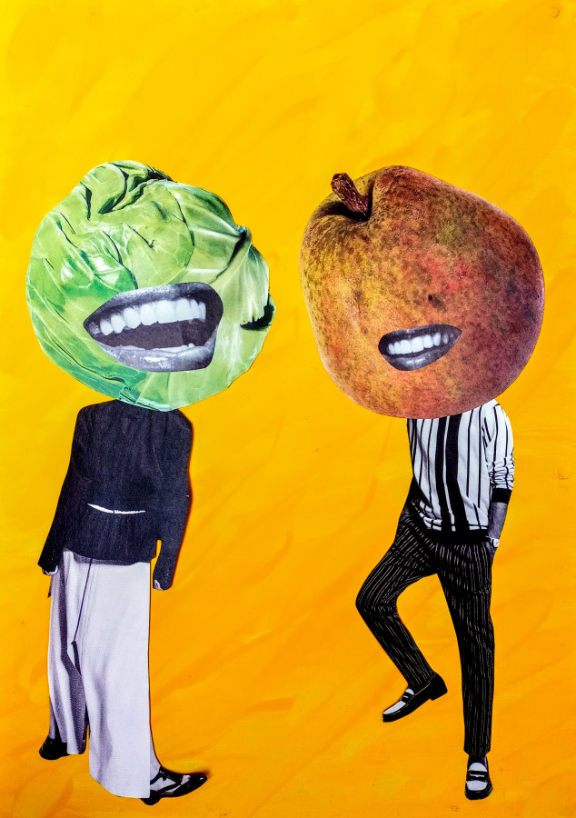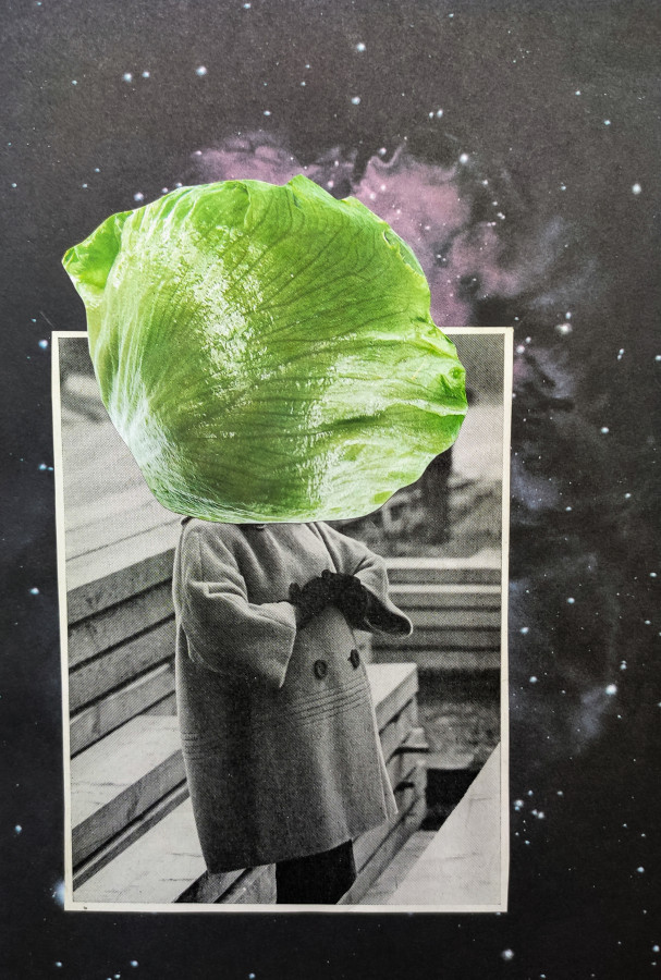 In mijn werk creëer ik analoge collages door beelden uit oude tijdschriften en boeken samen te voegen tot nieuwe werken. Ik vind ze in de kringloop of weggeefkastjes. Vaak plaats ik absurde en surrealistische afbeeldingen samen met plaatjes van fruit en groenten in een context van menselijke taferelen. Zij verbeelden alledaagse gebeurtenissen, maatschappelijke thema's en de wereld om ons heen.