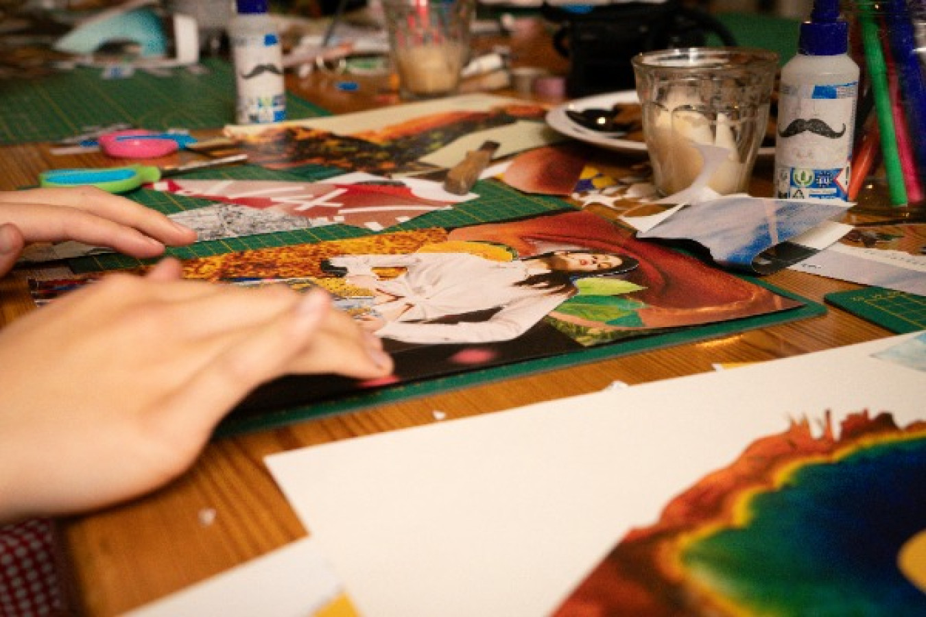 Collages maken in een groep zorgt voor verbinding tussen de mensen, makkelijker in gesprek gaan en je eerder open durven te stellen naar een ander toe. Dit kan tot hele mooie dialogen en natuurlijk kunstwerken leiden.