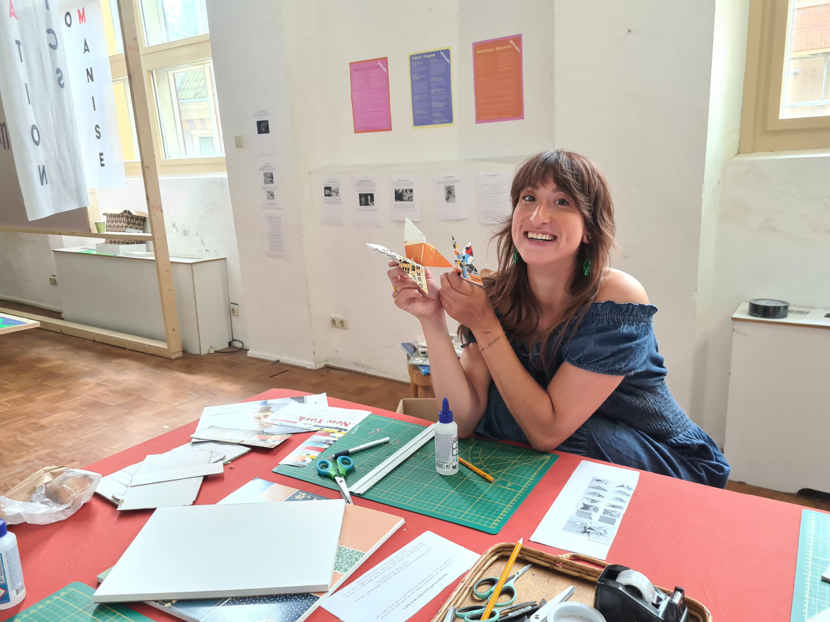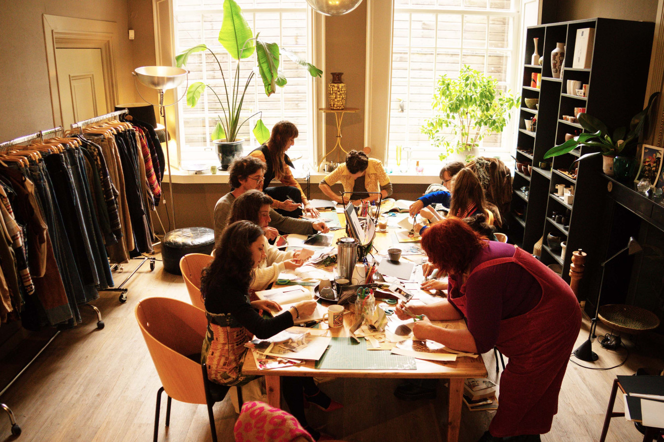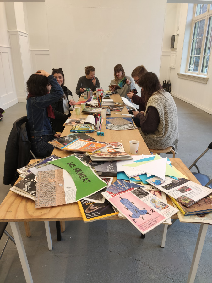 Een open collage-werkplek voor iedereen die overal kan stranden. Het enige wat er nodig is, is een tafel met een paar stoelen. Collages maken met mensen die spontaan langskomen en ook meedoen met een collage maken. Er ontstaan hier de mooiste gesprekken en er worden onverwachte lijntjes gemaakt.