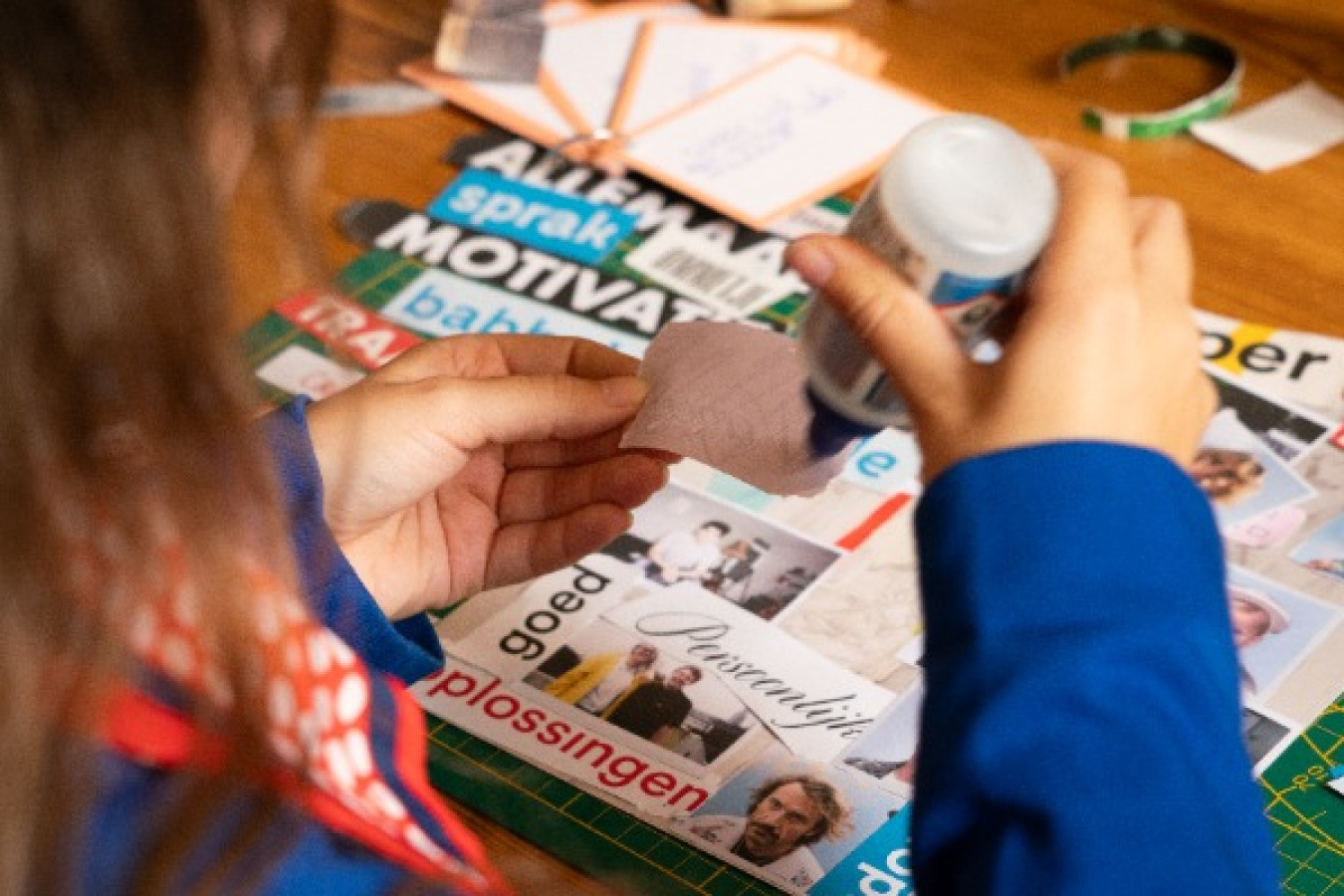 Iedere deelnemer neemt een afbeelding of foto mee dat iets over die persoon vertelt. We maken een persoonlijke collage met die afbeelding als basis. De collage vertelt wie jij bent. Daarna wordt de collage op de groeps-leporello geplakt en kan iedereen de andere groepsgenoten bewonderen en leren kennen.